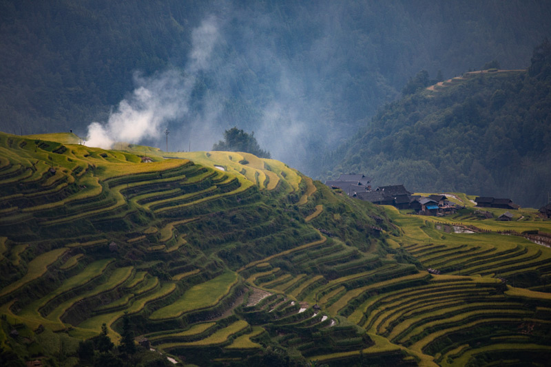 加榜梯田边升起袅袅炊烟(9月3日摄)。