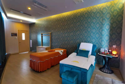 “苗浴水汇”装修风格的整体观感雅致精炼,用清爽的冷暖色系和谐调配,凸显出氛围的温馨舒怡。中西和合的主体装呈附着苗族风情壁画和精心点缀的饰品,一方独具匠心的现代感苗医(药)理疗圣地,落落大方地映入每一位宾客的眼里。
