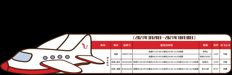 除了自驾,乘坐航班也可直达康定。成都周一至周日都有航班到达康定,杭州、重庆、拉萨每周也有固定航班到达。这样能省下路上的时间,更多享受大好风景。