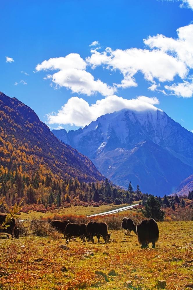 彩林之下,是一望无垠的草甸,这是亚拉雪山,赐予本地居民和牦牛的温柔。