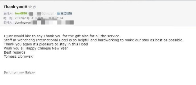 一封封温暖的表扬信,一句句HongKun Wencheng Hotel Very Good,承载着每一位宏昆人为“冬奥”服务的使命,是对酒店服务的褒奖,也是对酒店全心全意为顾客服务精神的肯定。