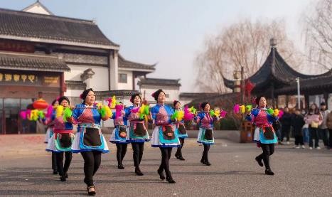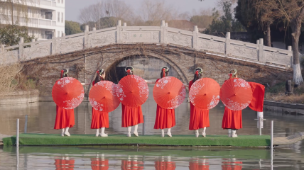 在甪直过年,打连厢是不可或缺的一项新年习俗。大年初一至大年初五,温婉的江南女子,穿上水乡传统服饰“八件套”,拿起五彩连厢,跟着节奏舞动,迎接着来自五湖四海的游客,祈求着新的一年风调雨顺、平安健康。